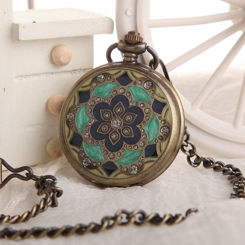 Title : YEVITA Montre collier ronde de poche quartz rétro à remontage manuel affichage analogique boîtier savonnette avec motifs fleurs et cristaux vertsASIN : B00FIZCKPK
